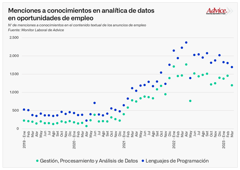 Reconociendo esta oportunidad, es cada vez mayor la cantidad de empresas que buscan técnicos y profesionales con conocimientos en análisis de datos, más allá de los cargos vinculados estrictamente a estas funciones. En los últimos años, ha habido un crecimiento exponencial en la demanda de conocimientos de gestión, procesamiento y analítica de datos, así como de los lenguajes de programación utilizados con estos fines (ver gráfica).