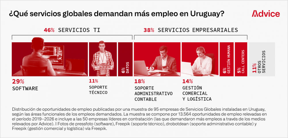In order to analyze the evolution of labor demand associated with Global Services in Uruguay, we built a sample of 95 Global Services companies established in the country, including the top 50 hiring companies (those that have generated the highest number of job opportunities since 2019 through the channels monitored by Advice’s Labor Monitor), totaling more than 13,500 job opportunities on which this analysis is based.